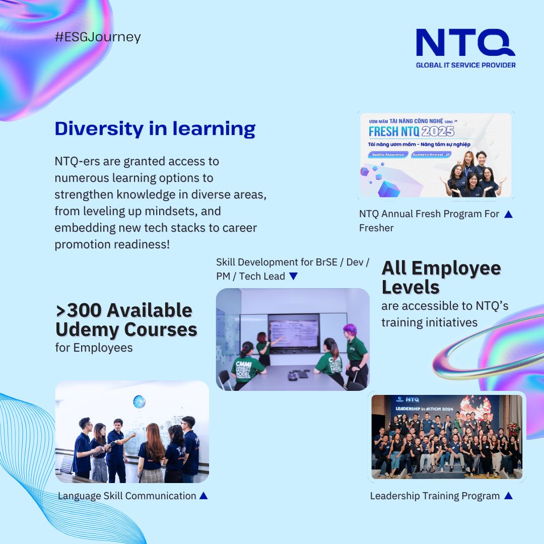 For executives at all levels, from junior to senior, NTQ focuses on enhancing skills to thrive in diverse environments, including language proficiency, collaboration, and fostering a global mindset. For technical roles, NTQ offers training courses that provide essential certifications from leading providers such as Microsoft, AWS, and Outsystems. As part of our investment in human resources, we have also developed an exclusive online hub featuring more than 300 high-quality courses from top global platforms like Udemy, supporting the lifelong learning needs of our team.