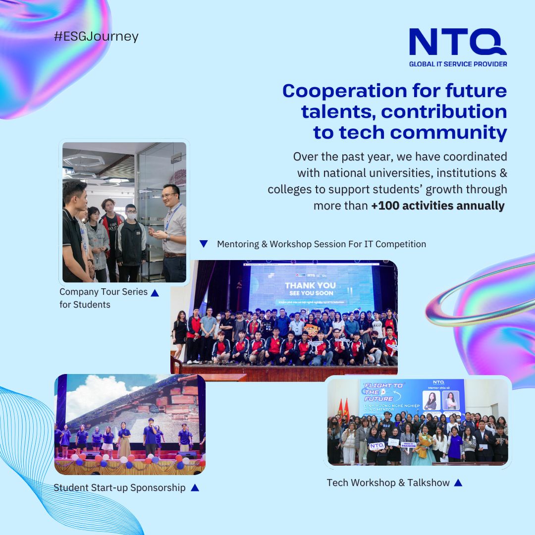 NTQ’s strategy for developing future talent focuses on actively supporting student initiatives and fostering the growth of young professionals in the field of IT. The company sponsors cultural events such as Korea Day and Japanese Language Night, and supports IT startup competitions like Tech Spark and Hackon AI. Additionally, NTQ backs national and international technology competitions, including the Vietnam National Olympiad in Informatics and the Robocon competition. The company also plays an active role in shaping the academic landscape by contributing to IT-related contests as exam setters and judges, as well as mentoring students through scientific research conferences. NTQ further enhances its partnership with educational institutions by offering professional development opportunities, such as providing 100% funding for short-term Cloud training courses.