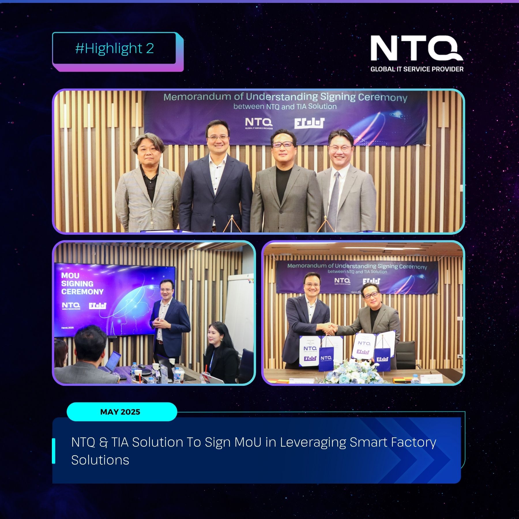 On May 27th in Hanoi, NTQ and TIA Solution signed a Memorandum of Understanding (MoU) to promote research activities and the development of smart factory solutions. This collaboration marks a significant step for NTQ in its strategy to scale up its capabilities and technical expertise, meeting the digital transformation needs of businesses in the industrial and manufacturing sectors.